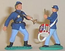 The bugler is a TIMPO figure with a new arm, I can't remember where the arm came from, probably a MARX toy soldier. The drummer boy began his military career in the Grenadier Guards, made by CHARBENS, he just had a head change and a repaint.